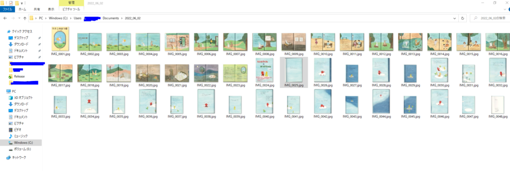 まず、絵本はA4サイズを超えているため、ご家庭にあるスキャナでは片面ずつしか取れません。片面ずつ地道に取り込んでいきます。